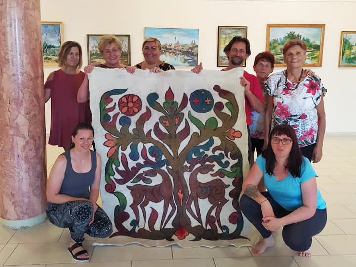 A felnőtt, amatőr alkotóinknak is igyekeztünk lehetőséget biztosítani, hogy egy új mesterséggel ismerkedjenek meg és sajátítsák el annak alapjait. Választásunk a nemezelésre esett. A műhelyfoglalkozásunk iránt nagy volt az érdeklődés, ezért 2 alkalommal is beterveztük és sikeresen megrendeztük az év során. A foglalkozások vezetője Aba P. Ákos nemez készítő népi iparművész volt, aki a gyapjú és a nemezelés eredetéről és hagyományos felhasználásáról is mesélt, mielőtt a kétkezi munkára sor került volna. A pályázati támogatásból nagy mennyiségben, kitűnő minőségű és többféle gyapjút sikerült megvásárolnunk, valamint az ehhez kapcsolódó eszközöket (szappan, fólia, vászon) is az alkotók rendelkezésére tudtuk bocsátani pályázati forrásból. Ennek köszönhetően színvonalas és maradandó élményt nyújtó műhelymunkát tudtunk biztosítani a résztvevőknek. Júliusban minden alkotó egy modern nemezelt selyemkendőt készített, míg szeptemberben, közös grafikai tervek alapján és közös munka eredményeként, az intézményünket díszítő, hagyományos magyar motívumokat megjelenítő falvédő elkészítésével zárult a hétvégi műhelyfoglalkozás.