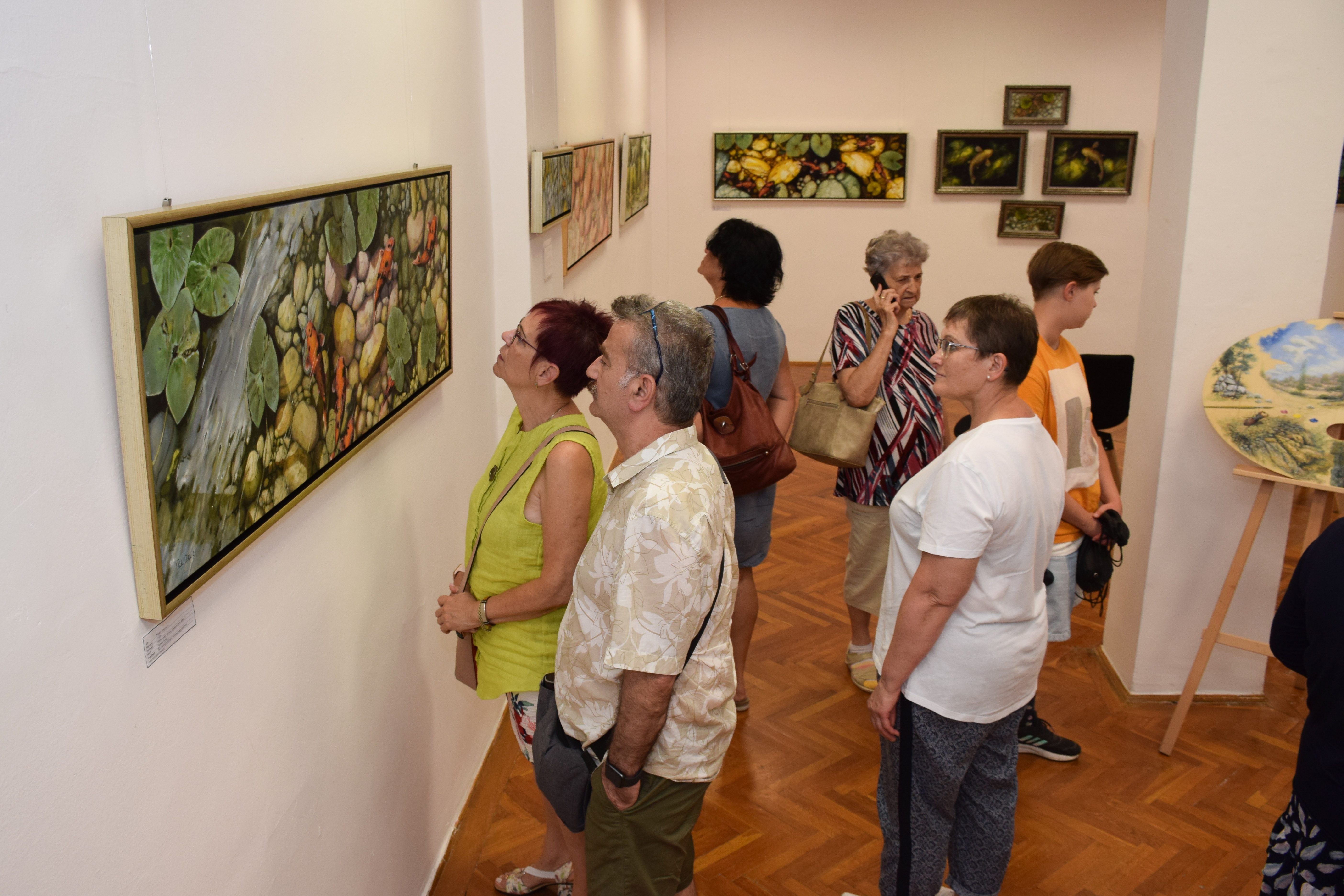 A kiállítóteremben a vizek és kövek világába hív minket az alkotó, csodás vízinövényekkel és különleges halakkal. Kiemelkedő a finoman megfestett vízfelület, a kövek formagazdagsága, a halak szinte élnek és megmozdulnak a képeken. Elárulta Zoltán, hogy évekig kiváló horgászként csodálta a vizet, a jól ismert élővilágát. Innen az ihlet, mely alkotásra késztette – részletezte a kiállított képek világát a közművelődési szakember.