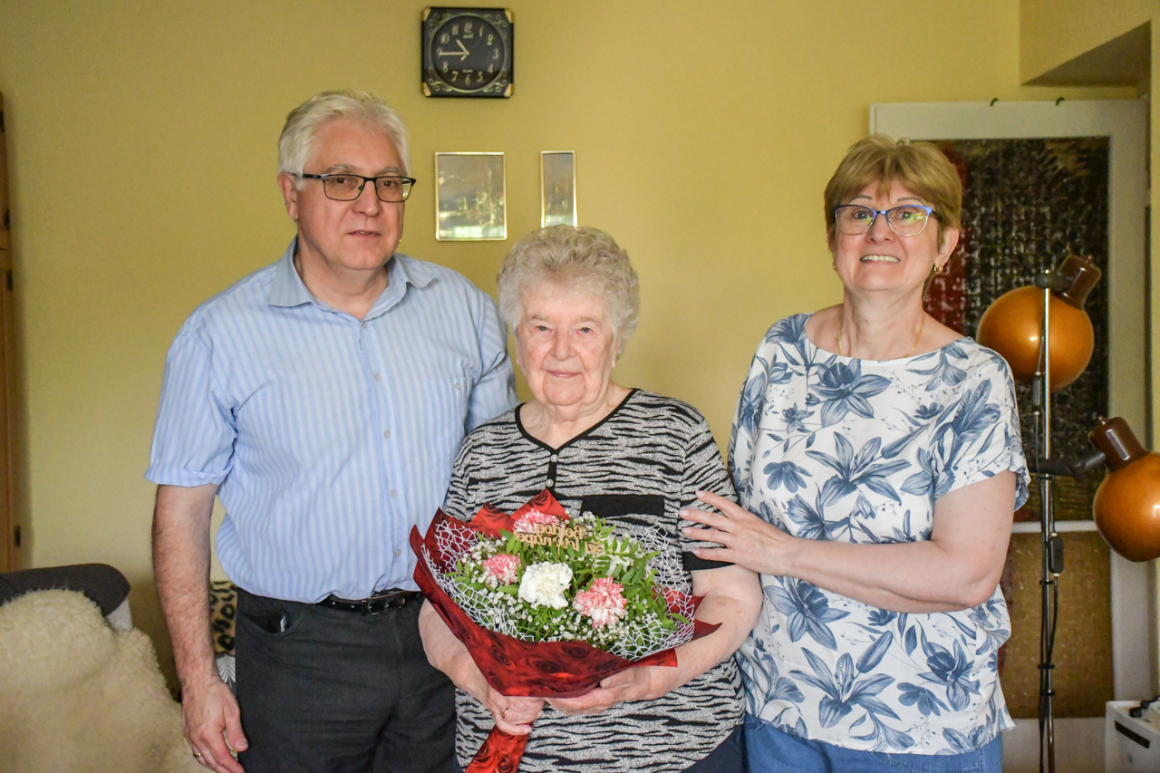 Tóth Lajosné Szabó Esztike nénit néhány éve, kilencvenedik születésnapja alkalmából köszöntötte Dr. Papp Antal polgármester és Szász Éva jegyző. Idén, 2025. július 13-án pedig a kilencvenötödik életévét ünnepelte, ami örömteli alkalmat adott a Polgármester Úrnak, hogy ismét meglátogassa őt Munkácsy úti otthonában.