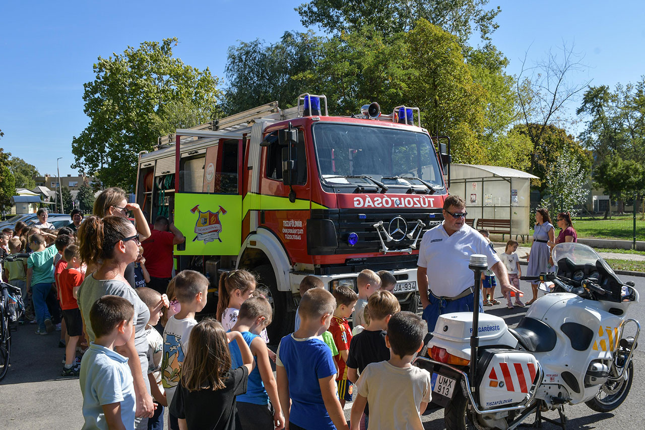 A József Attila Általános Iskolában reggel kerékpár ellenőrzést tartottunk a Martfűi Polgárőrség segítségével, ahol a szükséges tartozékokat néztük át. Küllőprizmát, lakatot és első-hátsó világítást kaptak a hiányos felszereltségű kerékpárosok, a támogatásokból beszerzett készlet erejéig. Közlekedési totót tölthettek ki az érdeklődő felső osztályos gyerekek, szeptember elején pedig rajzpályázatot hirdettünk, valamint kerékpárszépségversenyt is tartottunk. A programok délután folytatódtak, a 5.b és 8.a osztályos tanulók Balasi István iskola rendőr előadásán vehettek részt, ahol fő téma volt a helyes és biztonságos közlekedés, középpontba helyezve az elektromos rollerrel való közlekedés veszélyeit.