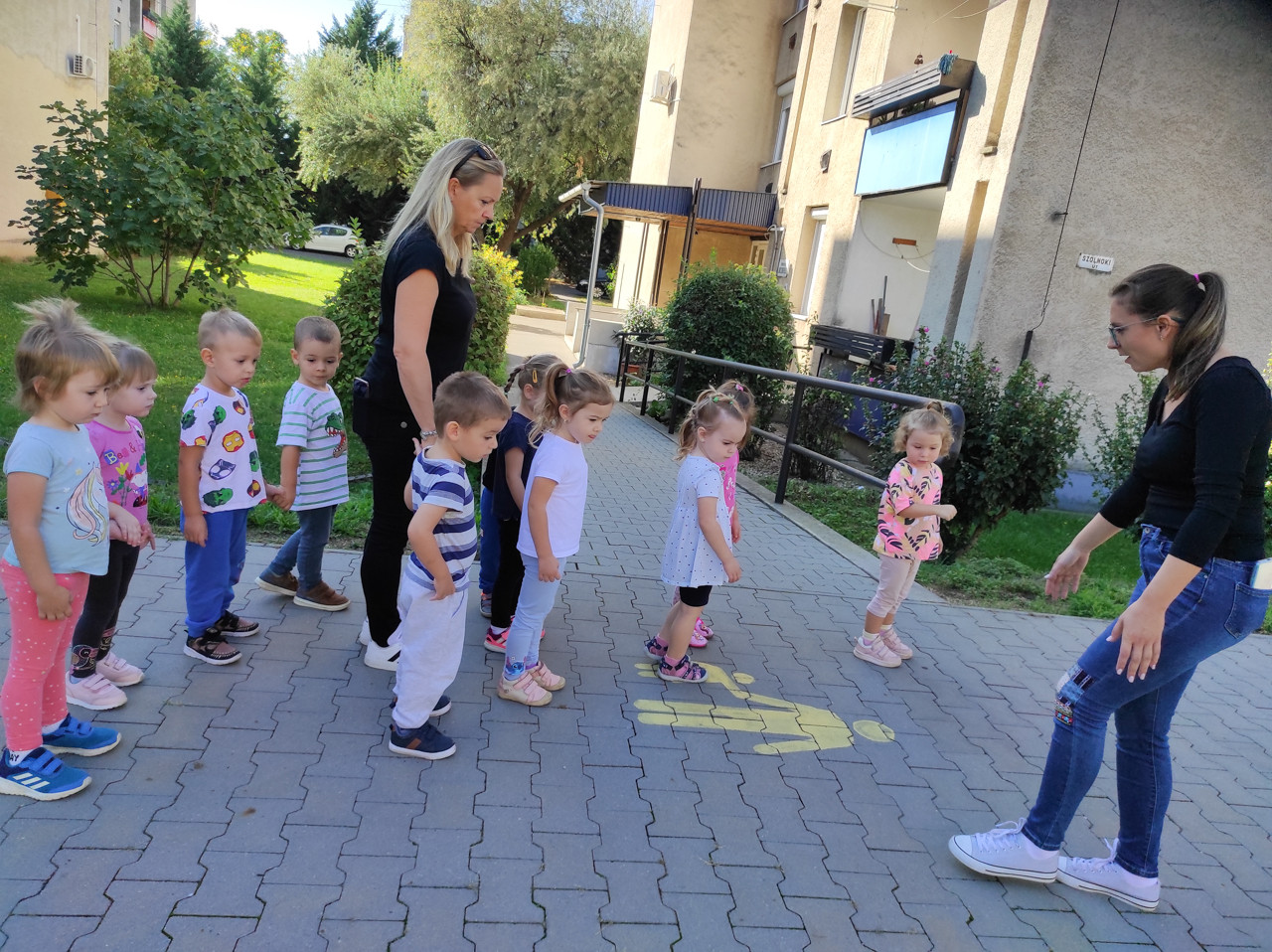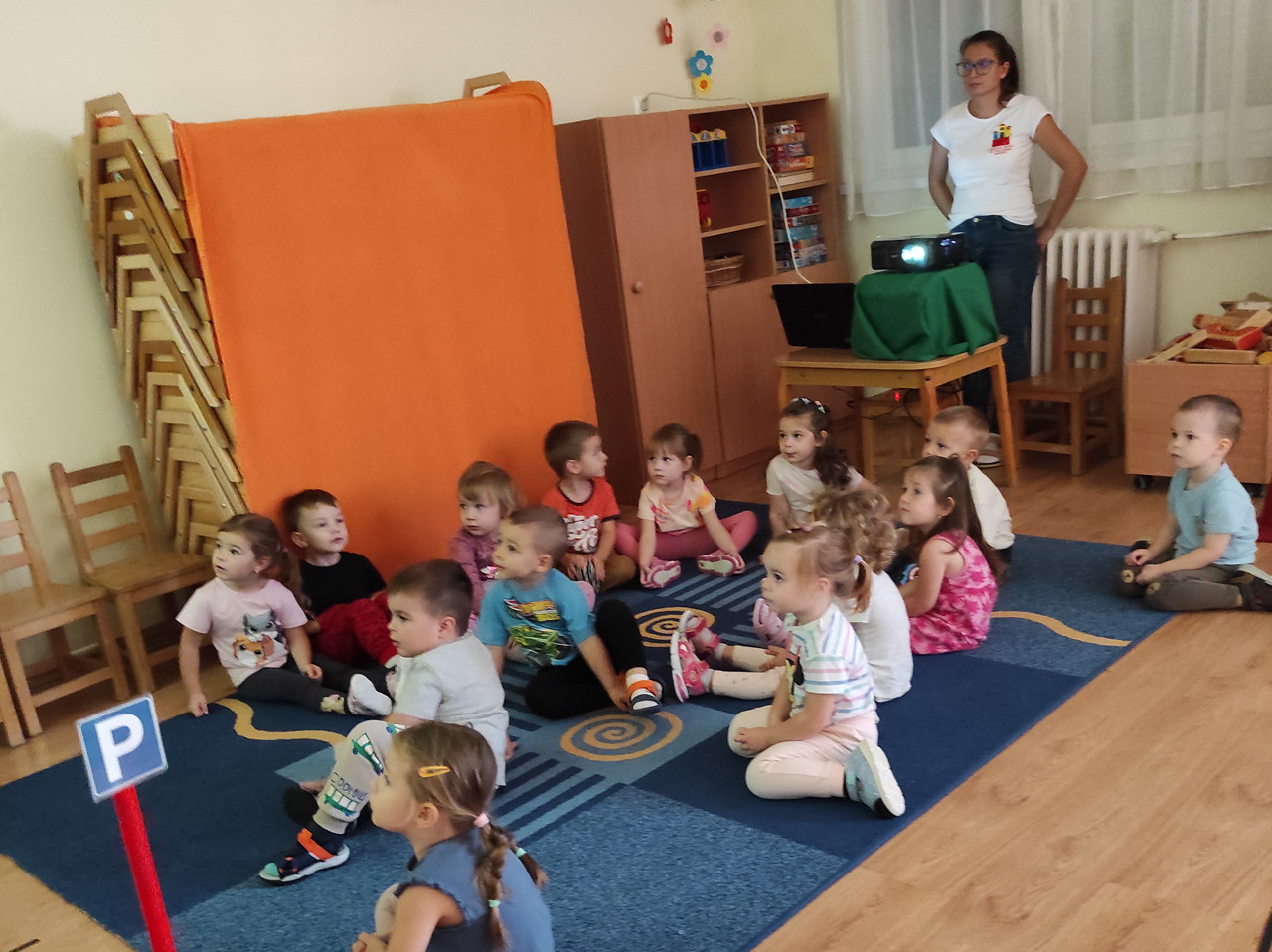 A benti helyiségekben közlekedési pályát alakítottunk ki, ahol napközben is közlekedőkké váltak a gyerekek, így például a gyalogos közlekedés legfontosabb szabályait játszva gyakorolhatták. A csoportszoba még a „Közlekedj okosan!” mesék vetítésének és más gyermekeknek készült oktató meséknek is otthont adott.