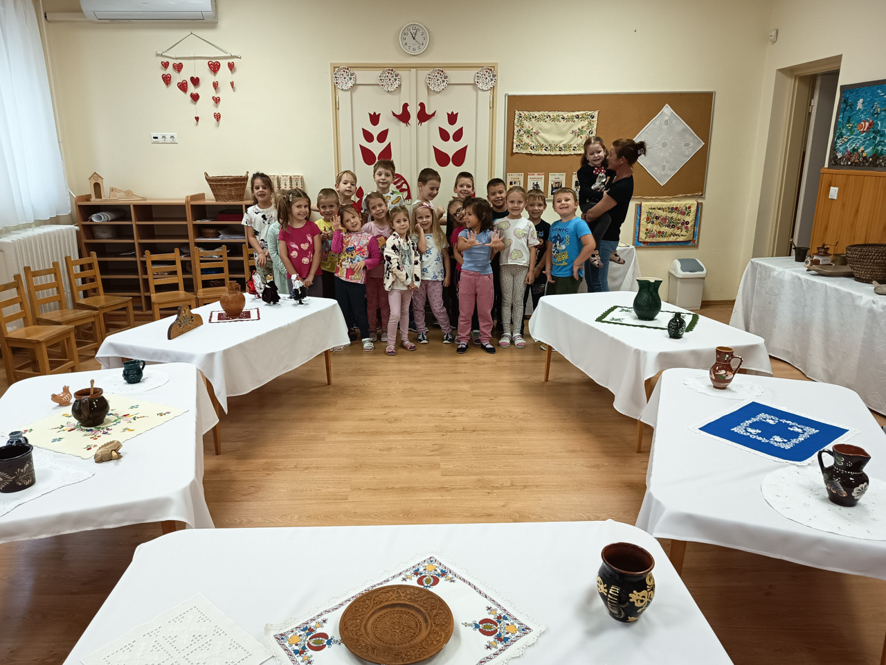 A Népmese hét alkalmából népművészeti kiállítást is rendeztünk óvodánkban. Sok segítséget kaptunk az óvoda munkatársaitól, valamint Szekeres Mónika Gizellától, Eiler Zitától és a Martfűn működő Díszítőművészeti Körtől, akik hozzájárultak kis népművészeti kiállításunk létrejöttéhez féltve őrzött kincseikkel, népművészeti tárgyaikkal. A gyermekek sok érdekes dologgal megismerkedhettek, melyeket a hétköznapokban ritkán láthatnak: hímzett terítőket, mázas edényeket, tányérokat, bögréket, régi konyhai eszközöket, darálót, rokkát.