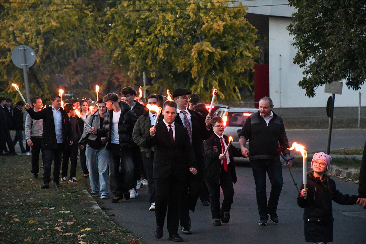 A megemlékezést követően, fáklyás felvonulás indult a Martfűi Református Templom 1956-os emlékhelyéhez, ahol a város lakói közösen tisztelegtek a szabadságért küzdők emléke előtt. A felvonuláson ismét nagy előszeretettel vettek részt városunk lakói, iskolások, pedagógusok, képviselők és civil szervezetek. Majd városunk polgármestere, kísérői, az intézmények, szervezetek képviselői koszorúzással tisztelegtek a hősi halottakra.