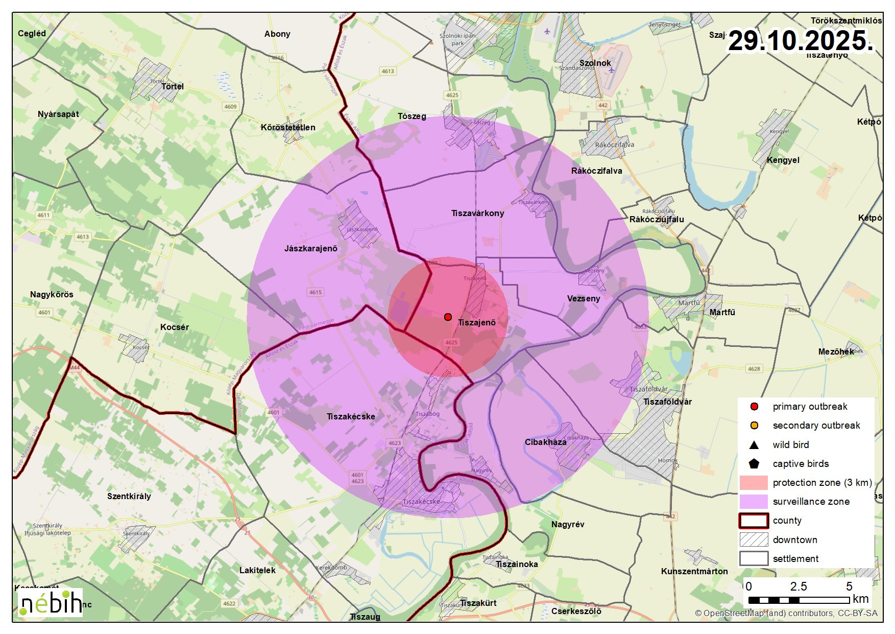 Tájékoztatjuk a Tisztelt Lakosságot és Állattartókat, hogy a Nemzeti Élelmiszerlánc-biztonsági Hivatal Állategészségügyi Diagnosztikai Igazgatósága 2025. október 28-án kelt eredményközlője alapján a Jász-Nagykun-Szolnok vármegyei Tiszajenő településen található pecsenyekacsa tartó telepről származó mintákból magas patogenitású madárinfluenza (H5N1) vírus került kimutatásra. Azonnal intézkedés történt az érintett állomány felszámolásáról.